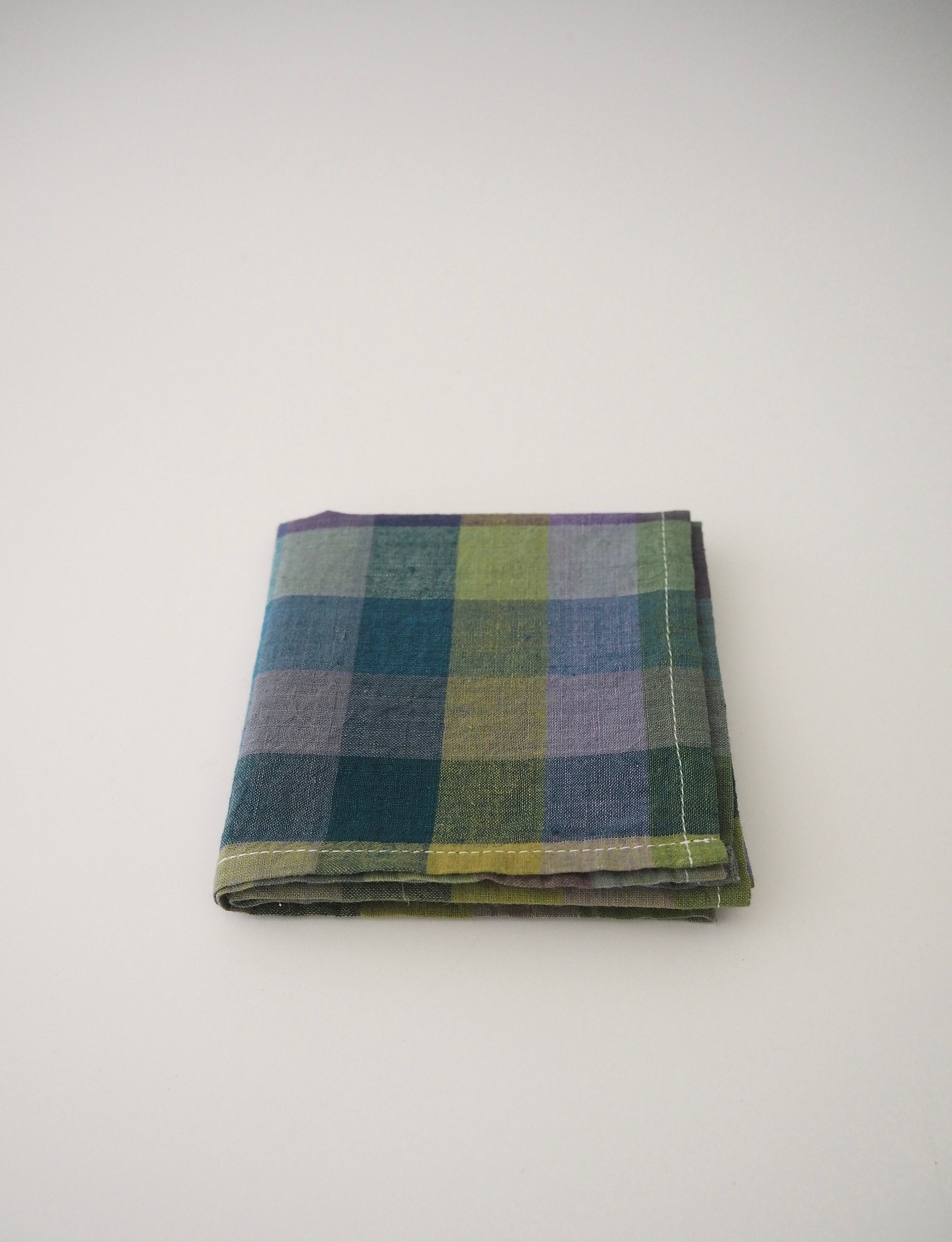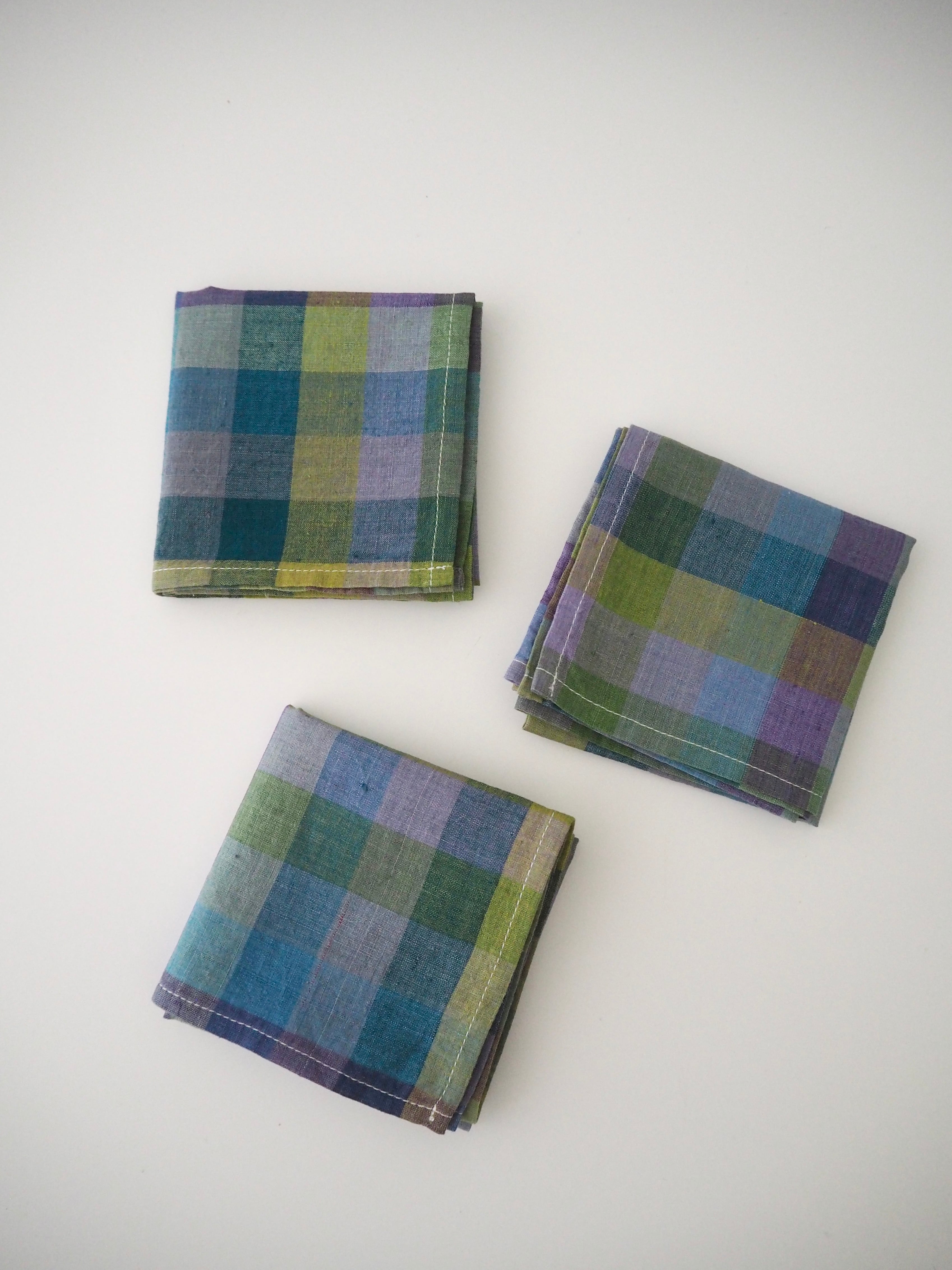 インドで手仕事布のデザイン企画・生産などの活動をされている「CALICO」さんの、マルチカラーチェックのカディコットン生地をハンカチに仕立ててみました。