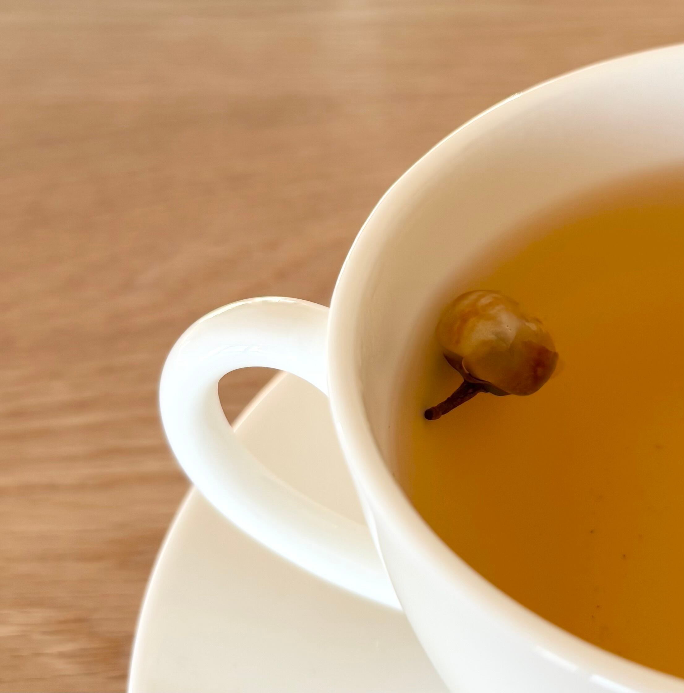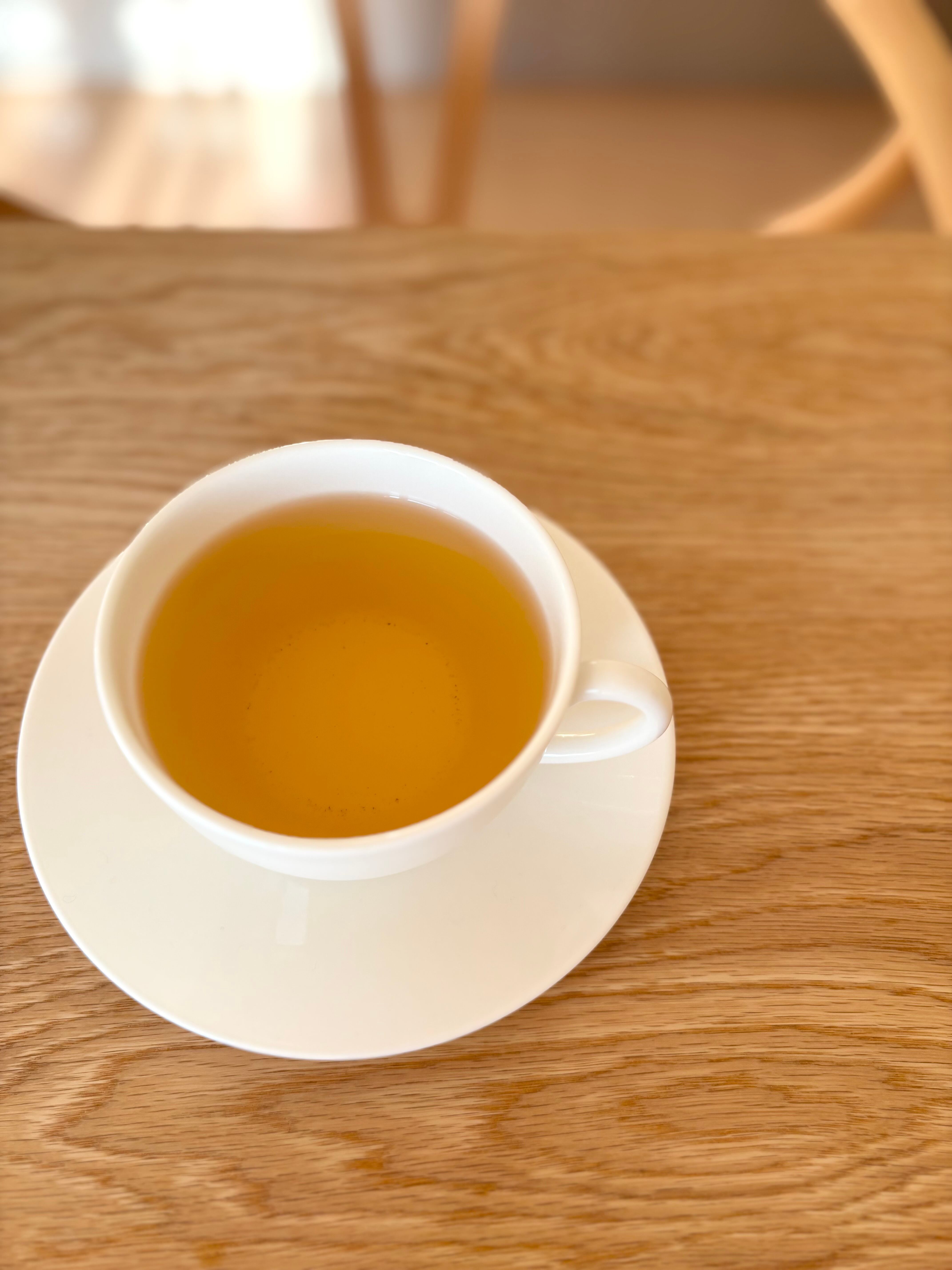 烏龍茶と釜炒り茶のブレンドにお茶の花が添えられた、tubomi。