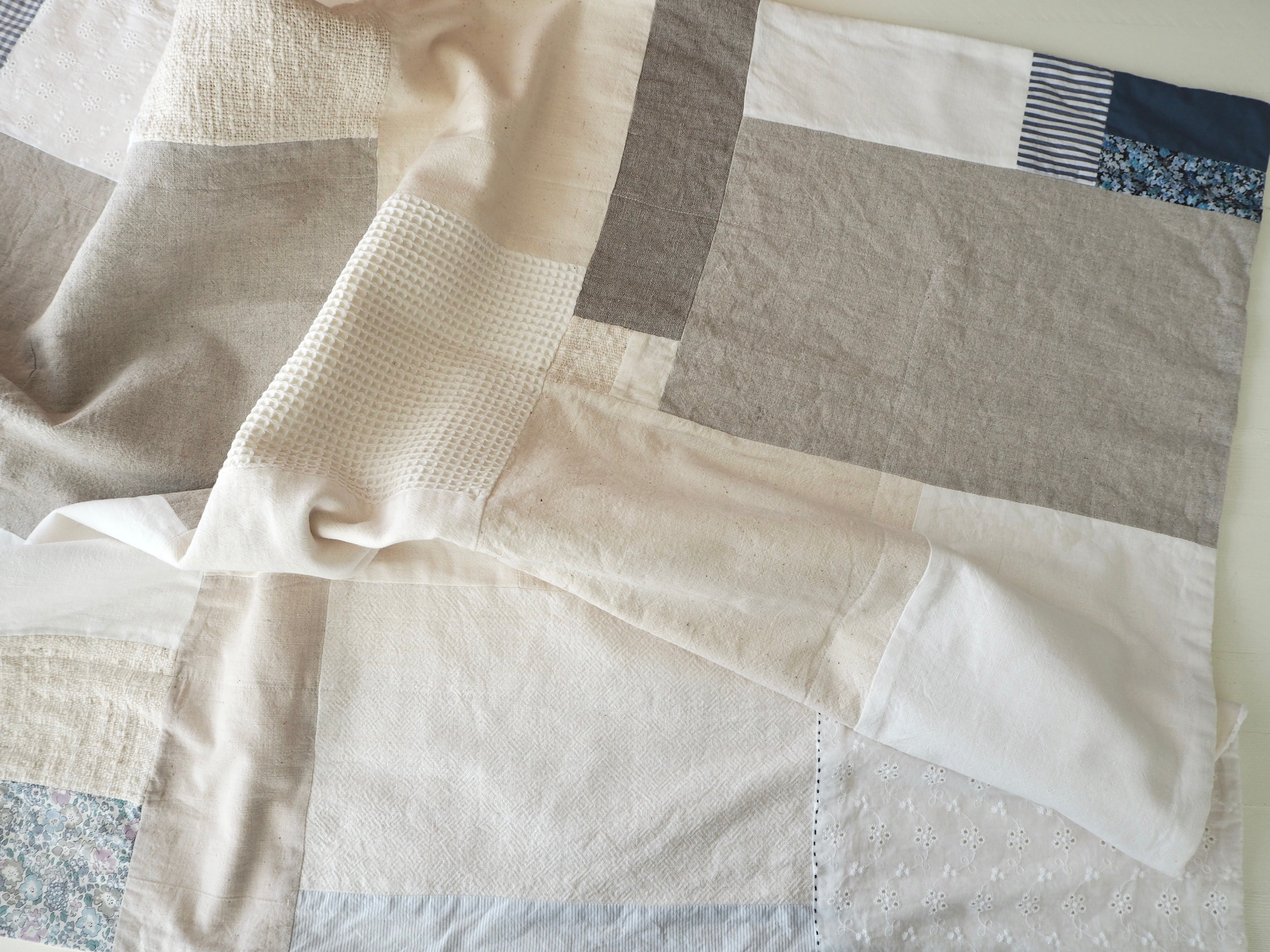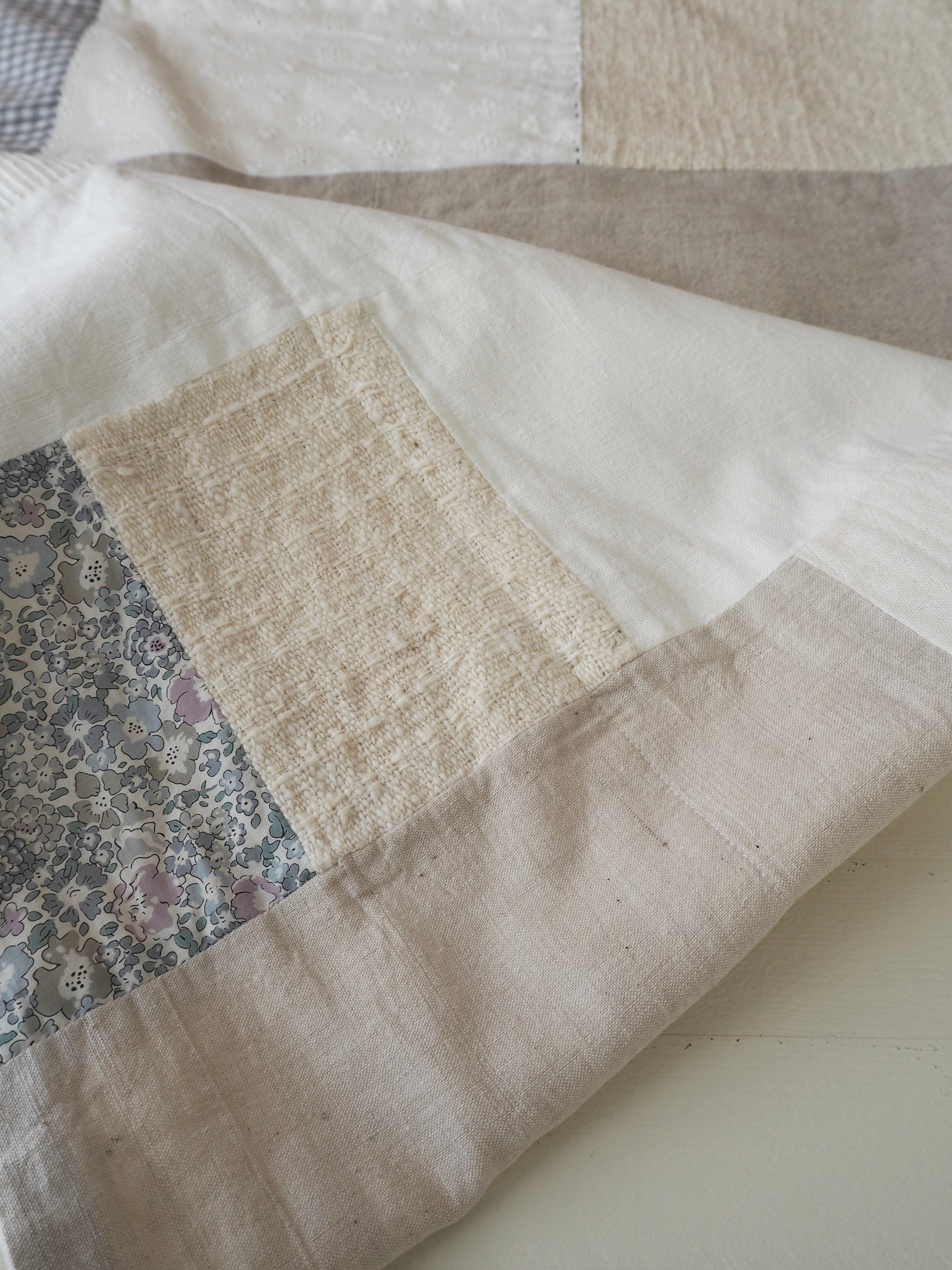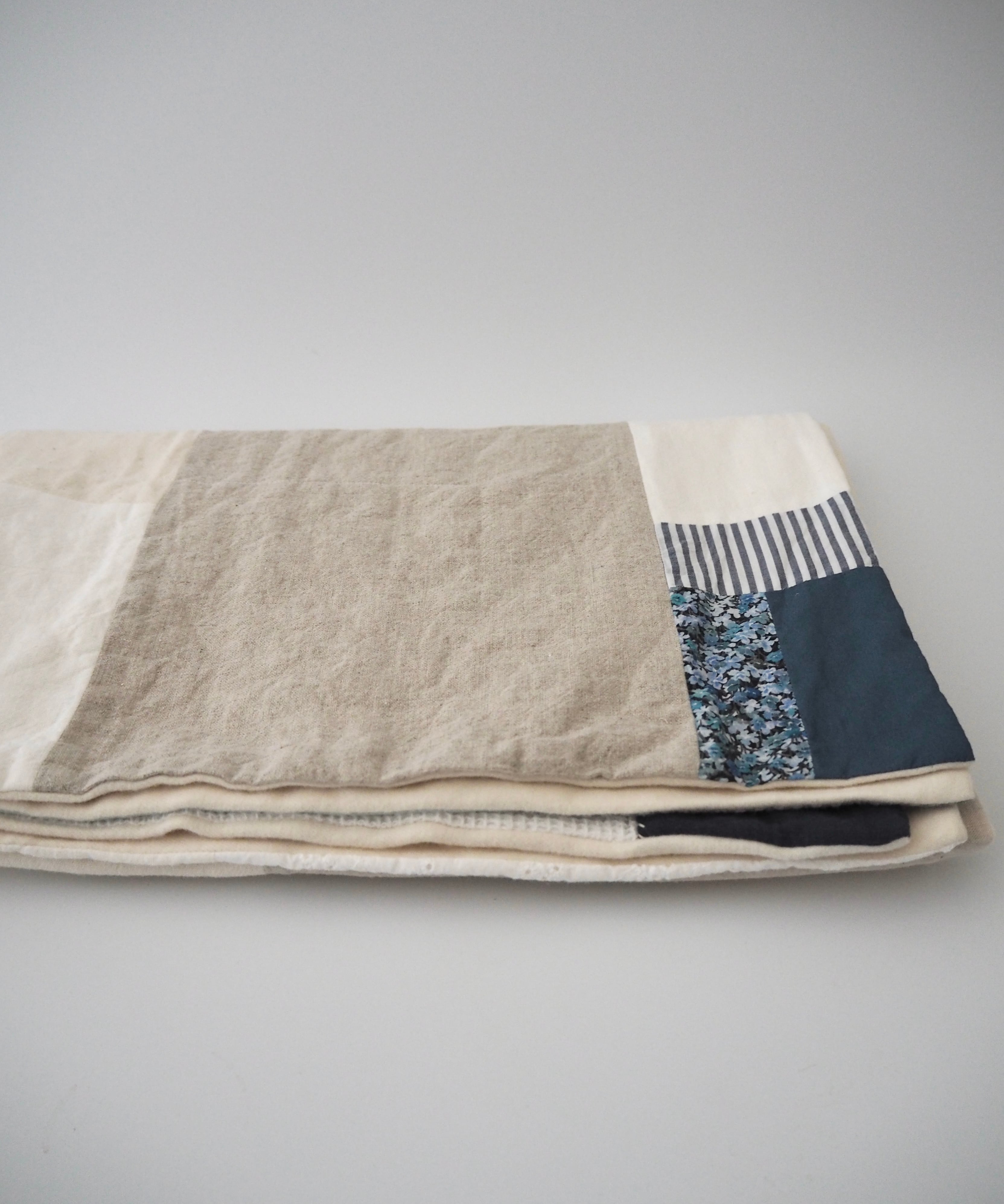 カディコットン(手紡ぎ・手織りの綿布)や、リネン、タイの手織り布に、ワッフルやガーゼ、リバティの花柄など、いろいろな生地を組み合わせてパッチワークしたものをブランケットに仕立てました。