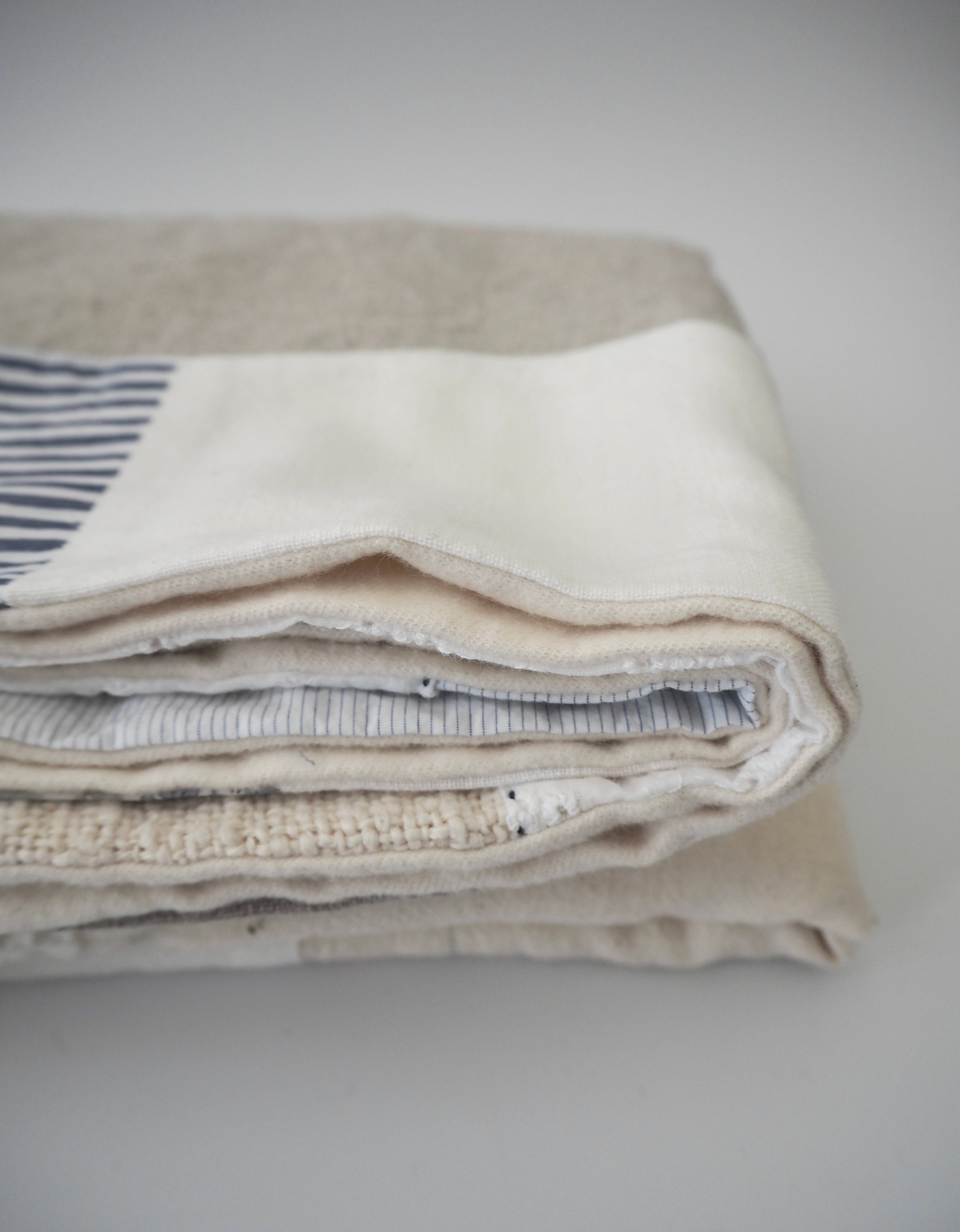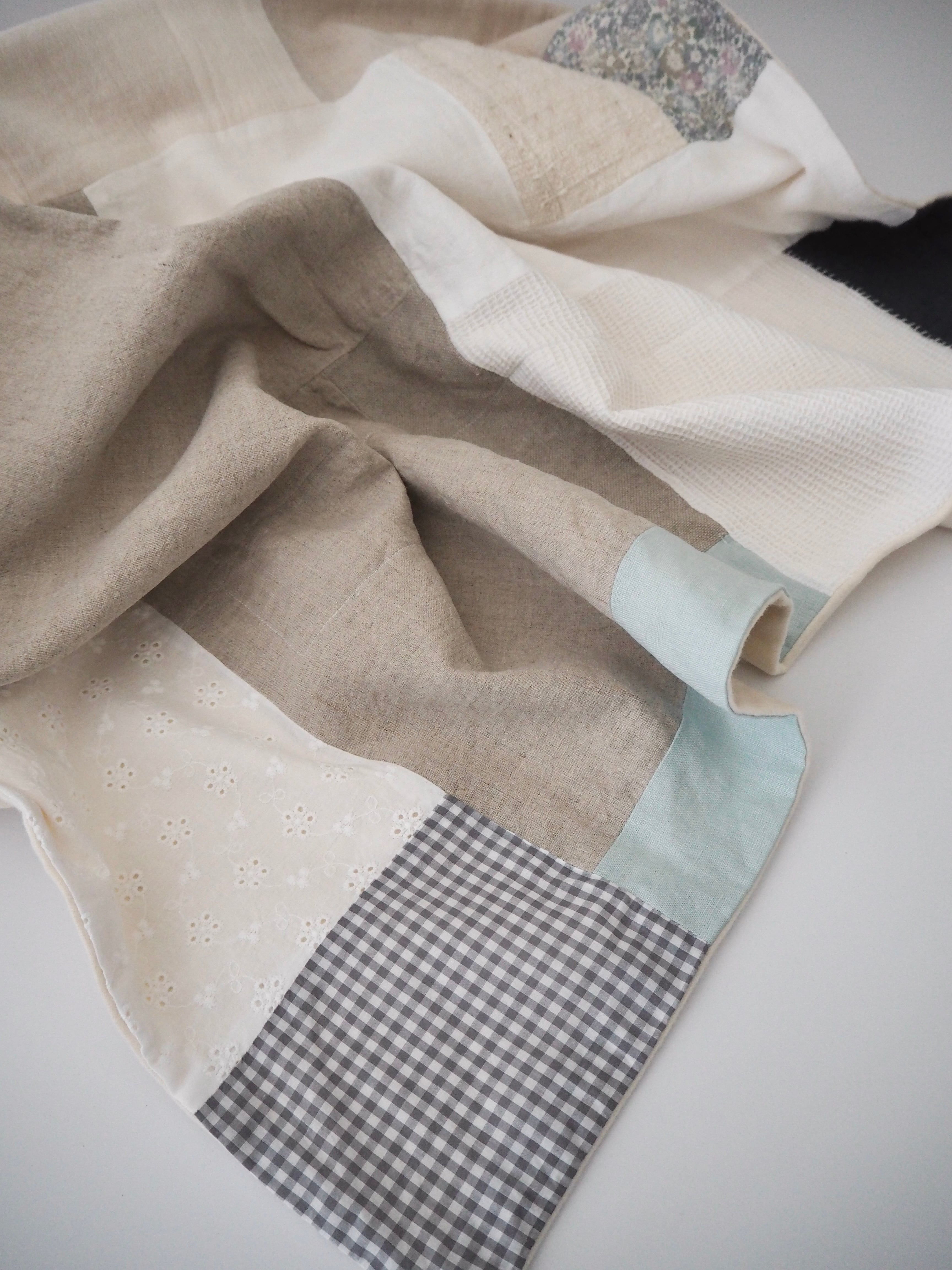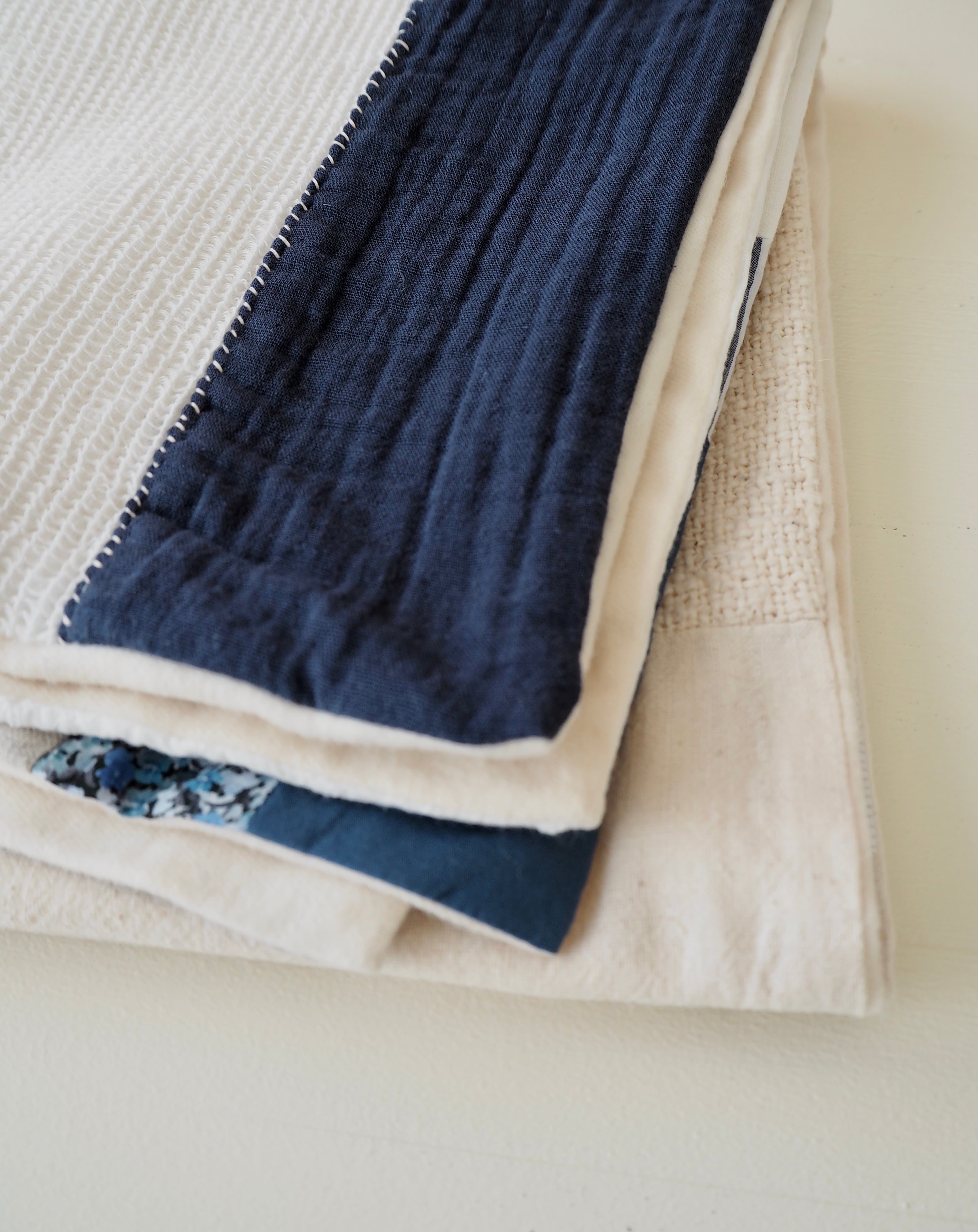 カディコットン(手紡ぎ・手織りの綿布)や、リネン、タイの手織り布に、ワッフルやガーゼ、リバティの花柄など、いろいろな生地を組み合わせてパッチワークしたものをブランケットに仕立てました。
