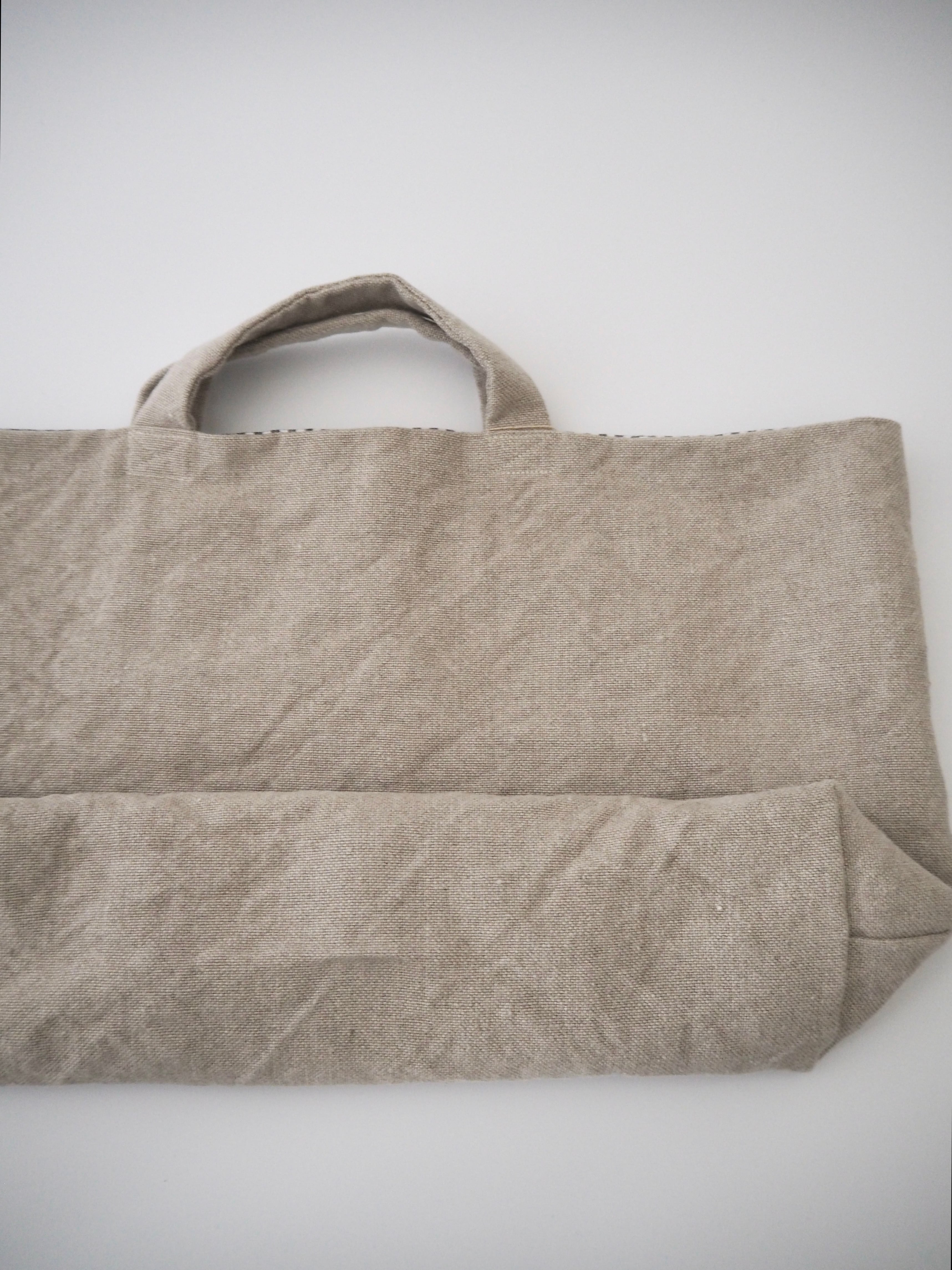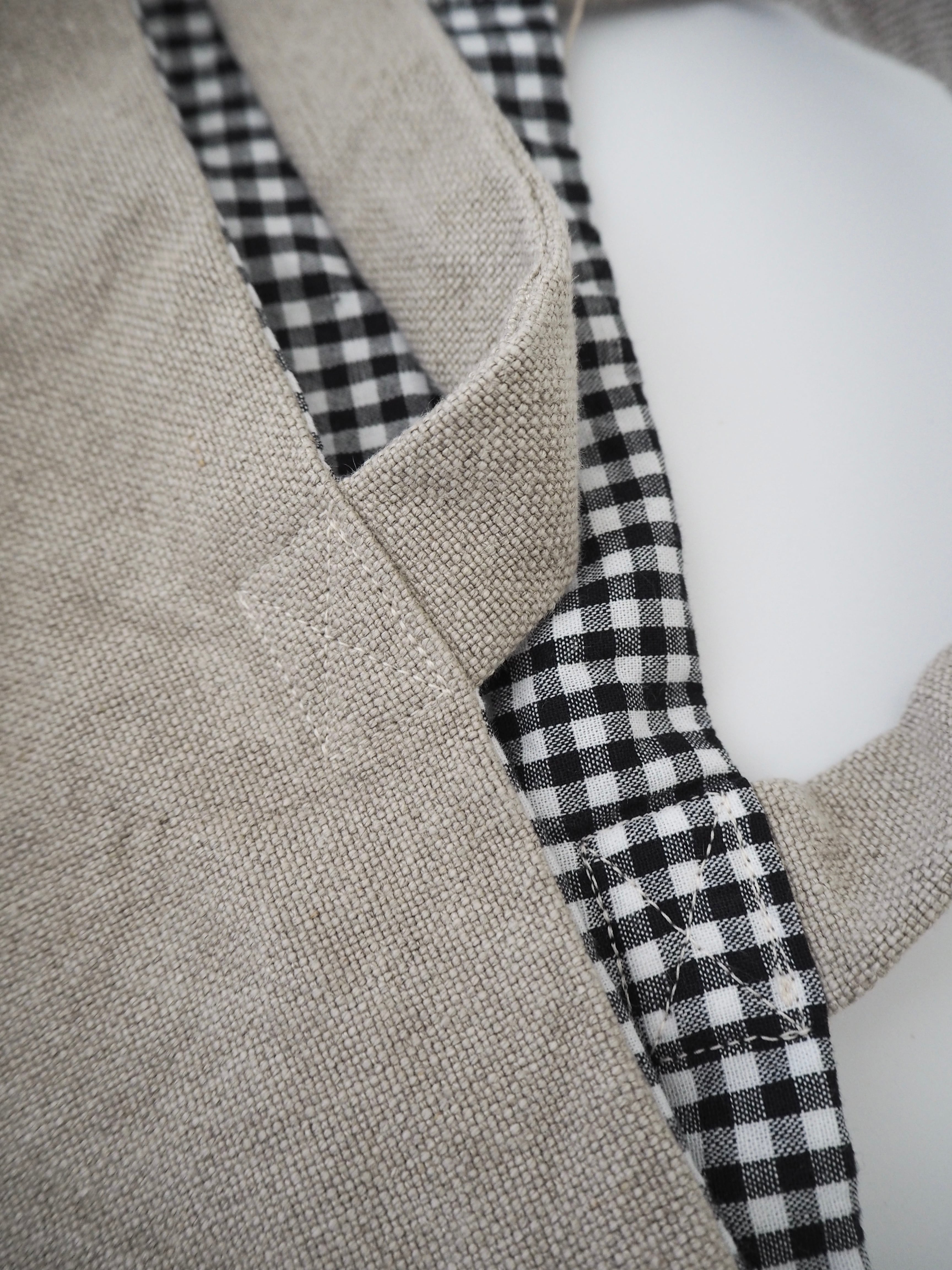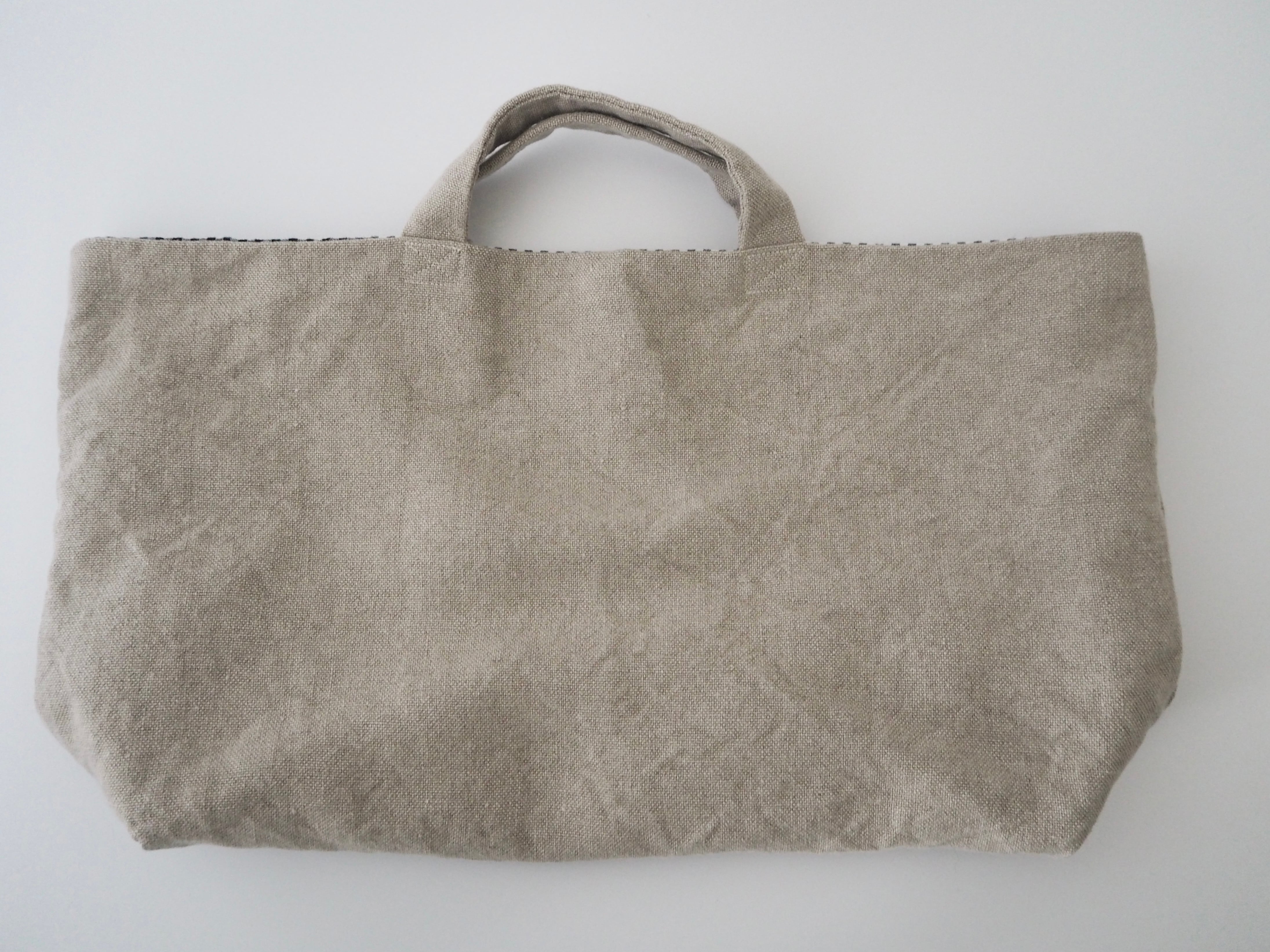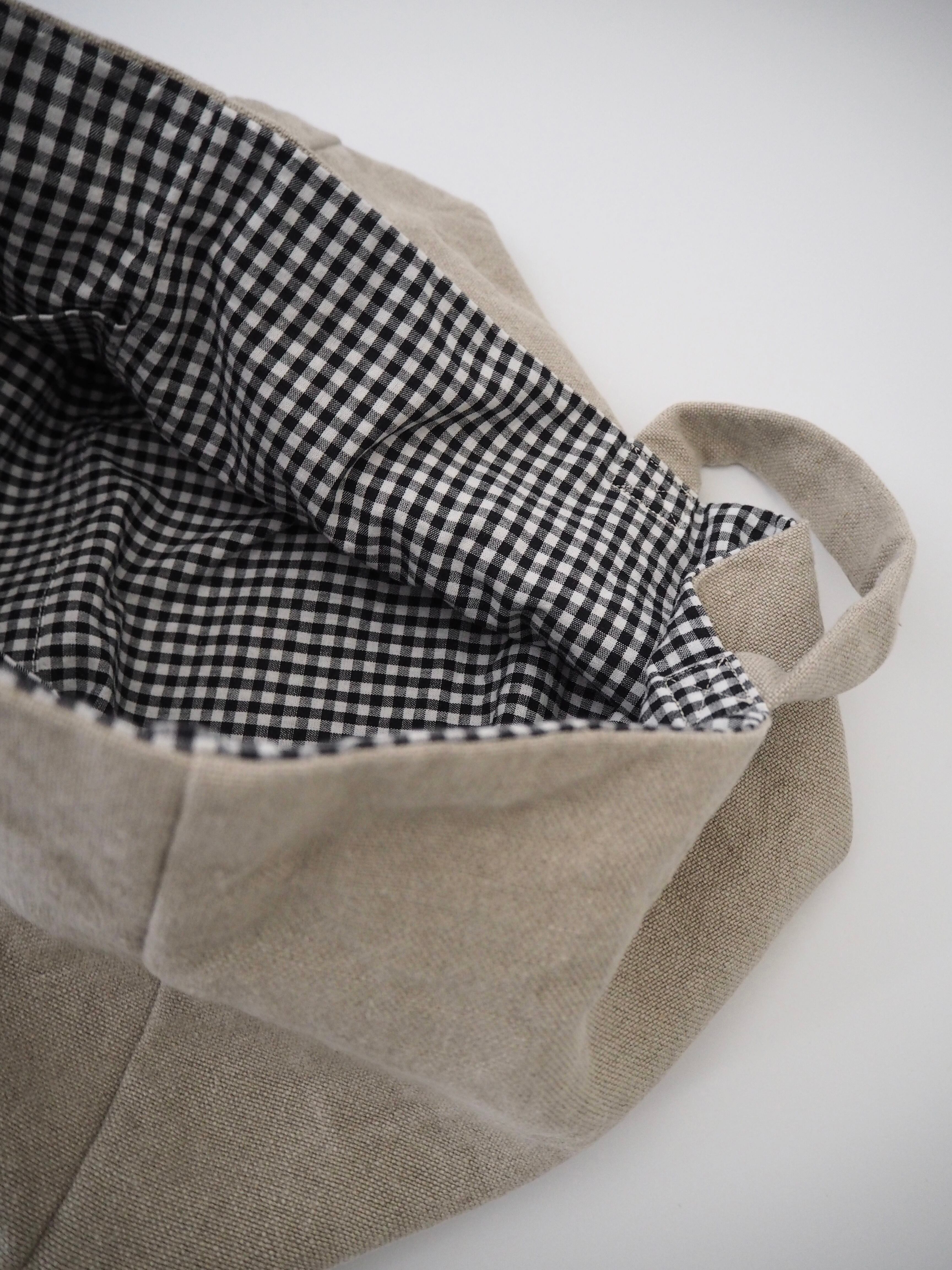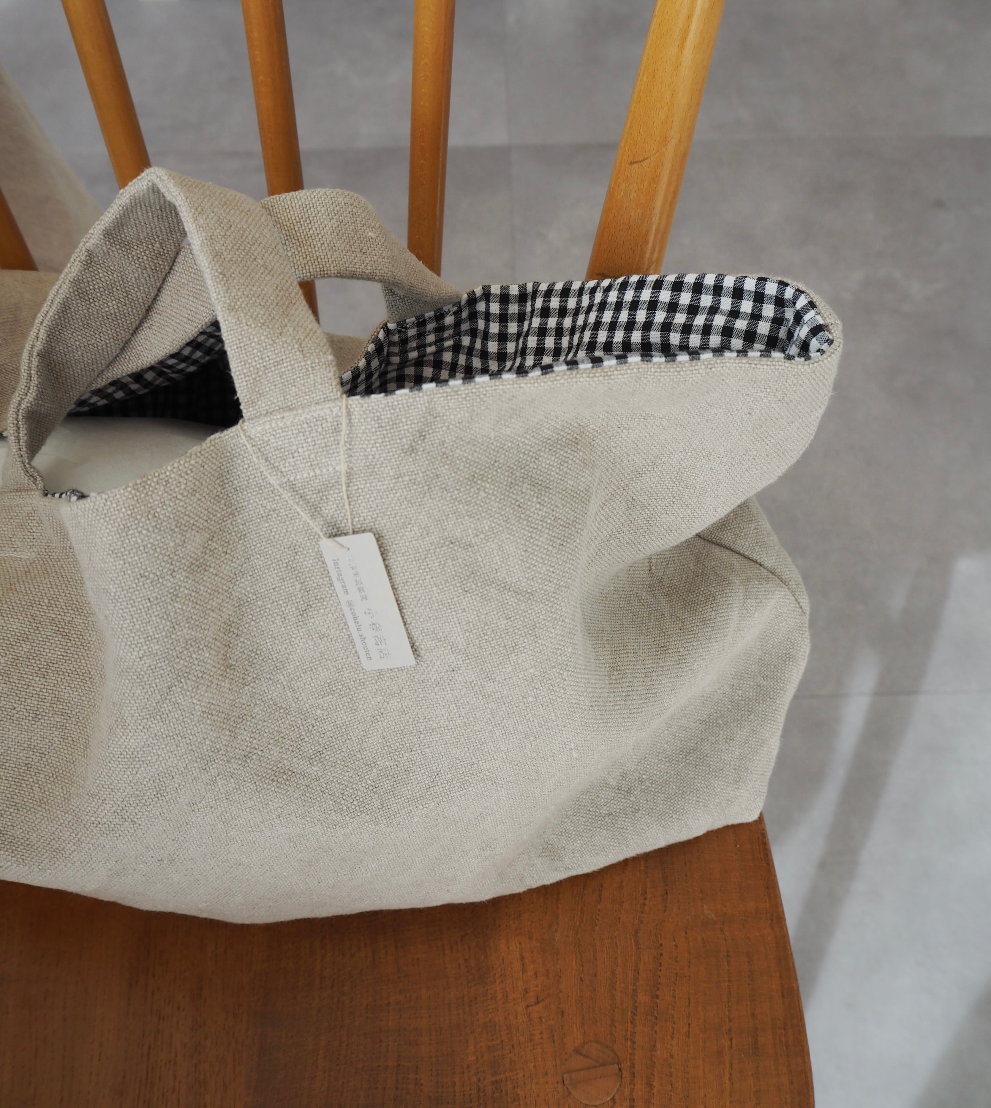 厚めのリネンの生地を表面に、内側に白と黒のギンガムチェックの綿生地を合わせて作ったトートバッグです。