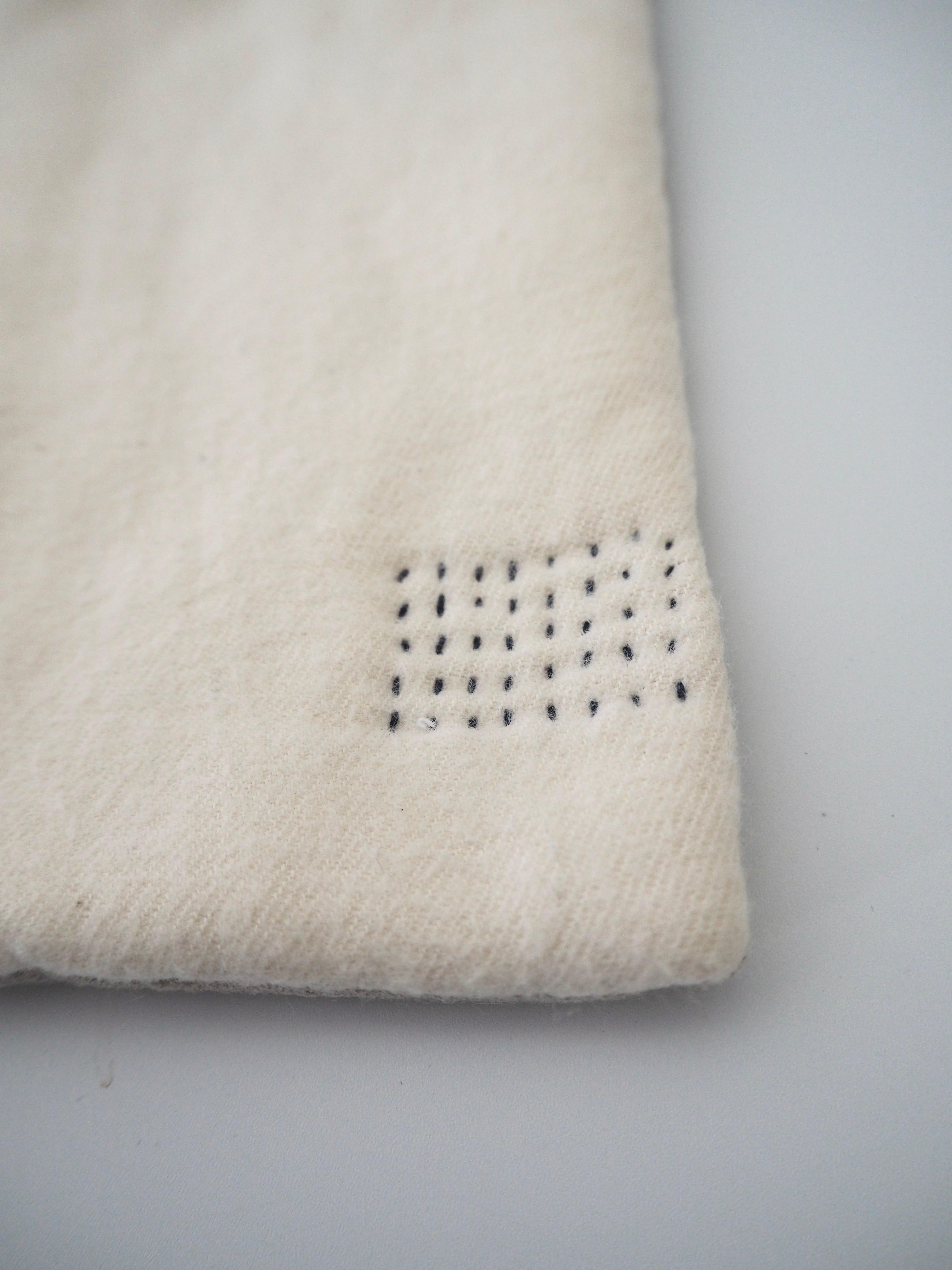 生地の押さえとワンポイントに、紺色の糸で手縫いのステッチを入れました。