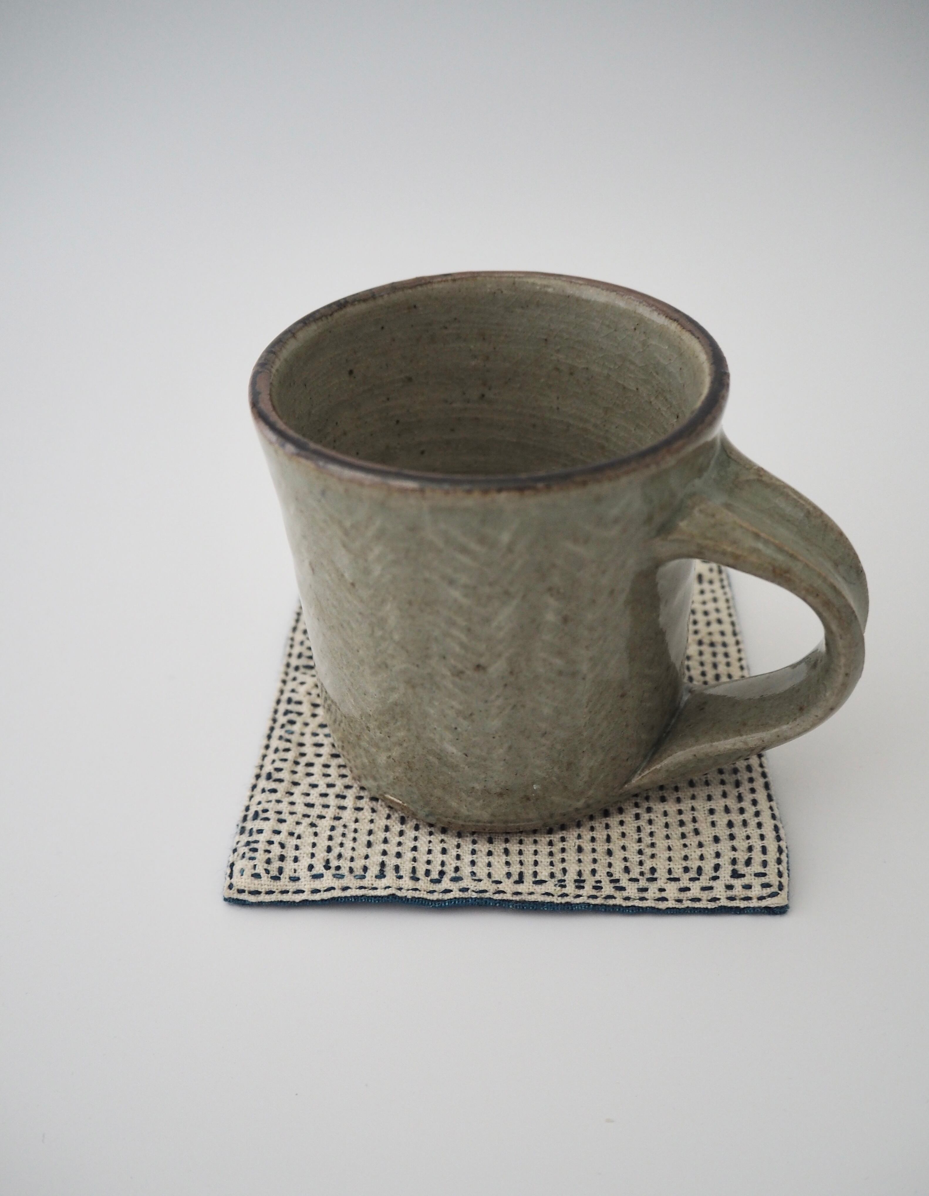 片側は白地に藍染の糸のステッチ、もう一方は藍染の生地の二枚合わせになっています。