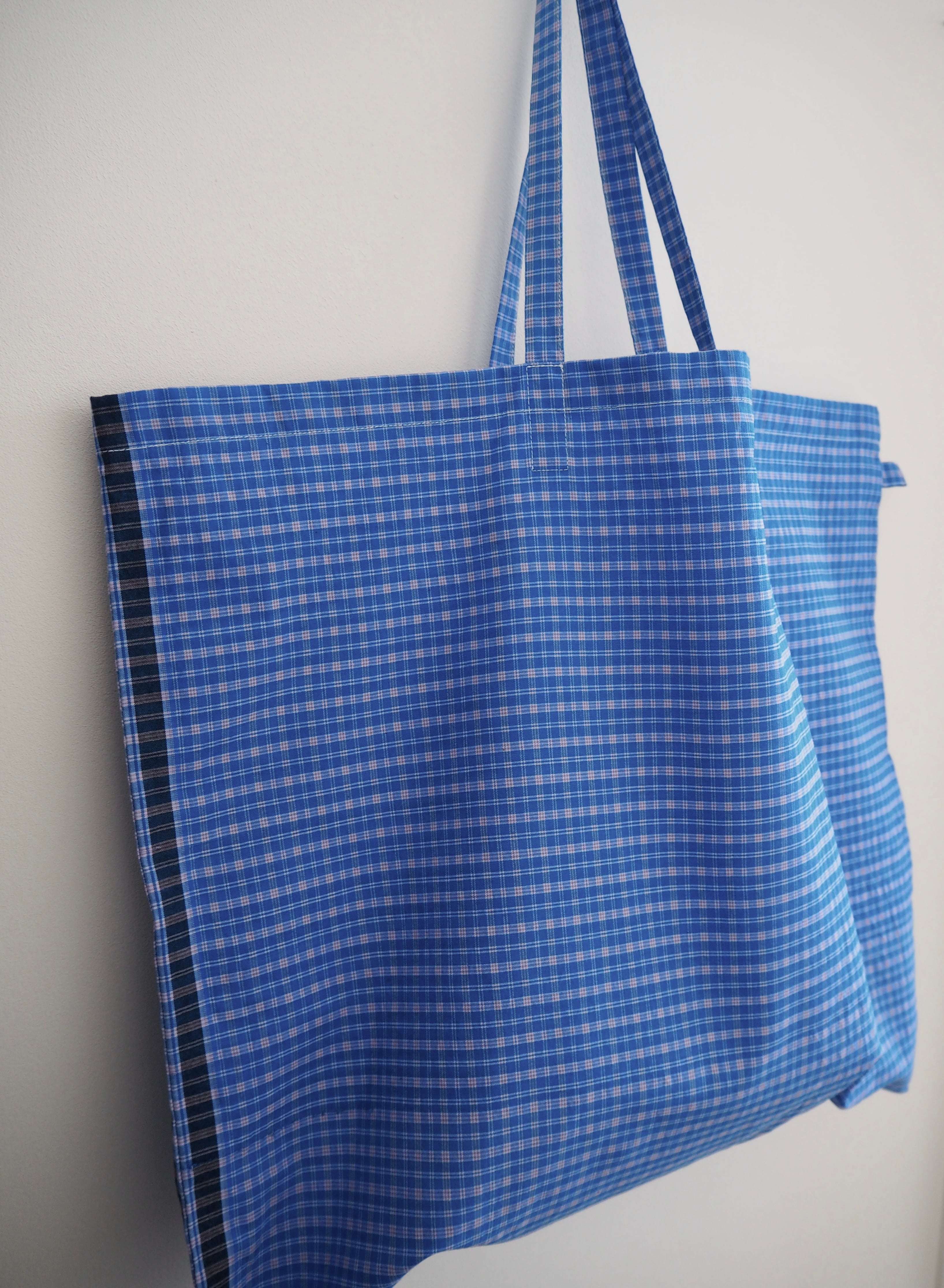 インドで男性の腰巻き布として使われているチェック柄の生地。軽くて丈夫な素材を生かし、買い物などに使える大きめのバッグに仕立てました。